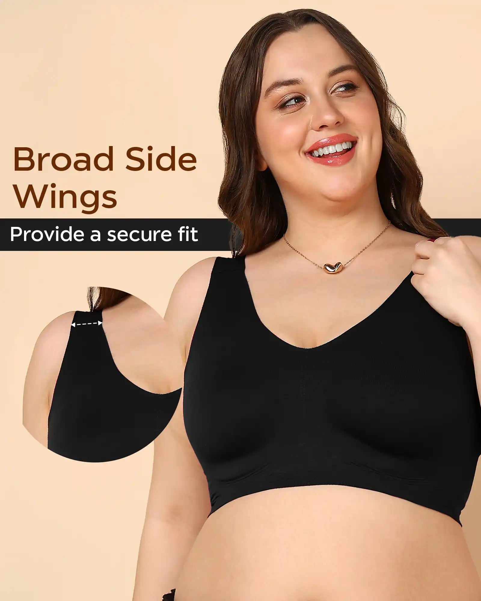 The wide cotton shoulder straps distribute weight evenly, preventing shoulder strain while staying soft and breathable on your skin. Broad side wings with internal gripper keep the bra in place and reduce side spillage for a smooth, bulge-free finish.