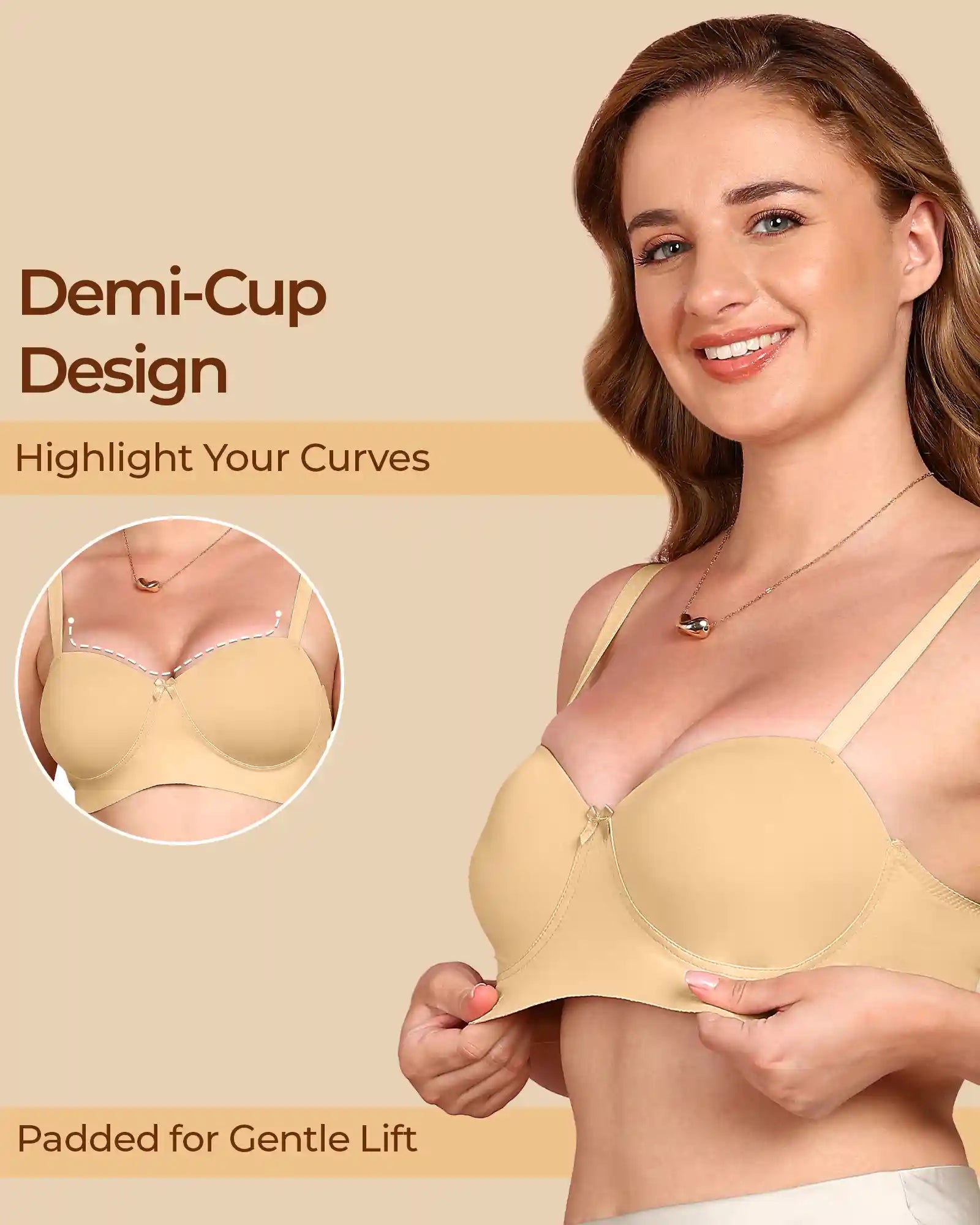 Demi-cup neckline with clean sides and back for a polished, t-shirt-friendly finish under everyday wardrobes. -